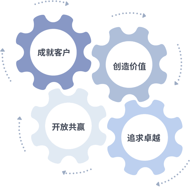成就客户是一切决策的出发点,,创造价值是衡量所有工作的标准,,,追求卓越是我们做事做人的态度,,,,开放共赢是我们的格局也是最终的结果。。。价值观的齿轮环环相扣,,,推动着组织里的每个人不断向前。。。